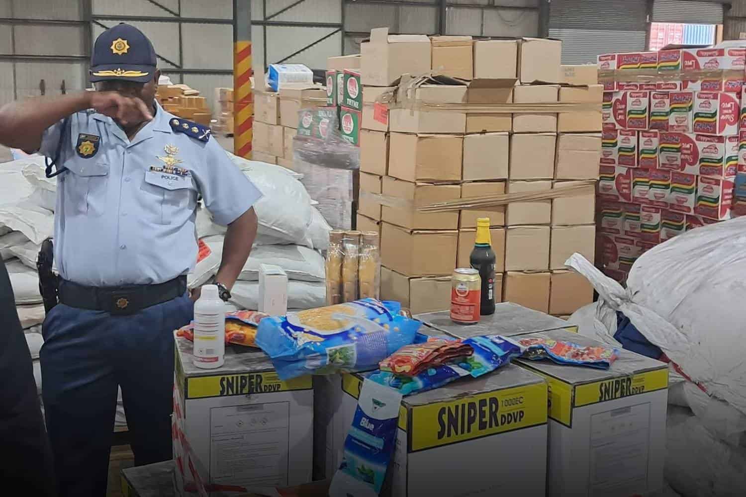 During their inspection, authorities found food and medical supplies that were not certified by the South African Bureau of Standards (SABS).